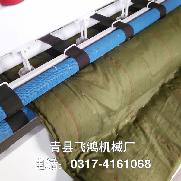 棉被機也可叫做絎縫機,絎縫是指用長針縫制有夾層的紡織物,使里面的棉絮等固定。本機器制作棉被不留被頭,一人操作,兩分鐘可引一床被,針距均勻大小可調(diào),七針,九針,十一針可定做。