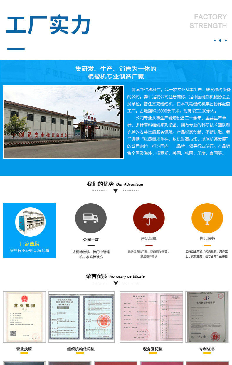 公司從事門簾行業(yè)多年,技術(shù)成熟穩(wěn)定。隨著多年市場磨合反饋改進(jìn),和對棉被機(jī)的進(jìn)一步研發(fā)升級,我廠現(xiàn)所生產(chǎn)棉簾機(jī)具有:故障率低,操作便捷,生產(chǎn)效率高的特點(diǎn)。我廠宗旨:以質(zhì)量求生存,以創(chuàng)新求發(fā)展。歡迎棉簾加工單位前來本廠參觀訂購。