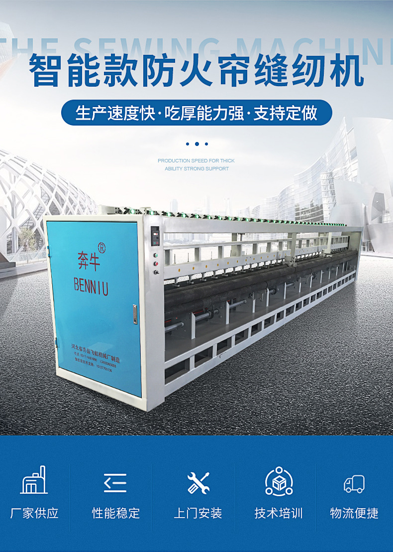 專業(yè)用于防火卷簾、巖棉簾、玻璃絲棉的縫紉,縫制出的無機布防火簾外觀平整美觀,并且?guī)r棉完全被縫紉固定,使礦棉不移位,不重疊,促使卷簾門收起時左右兩邊上升均勻不跑偏,從而提高產(chǎn)品質(zhì)量等級,節(jié)省手工縫紉時間,提高訂制壓條效率,降低人工成本。